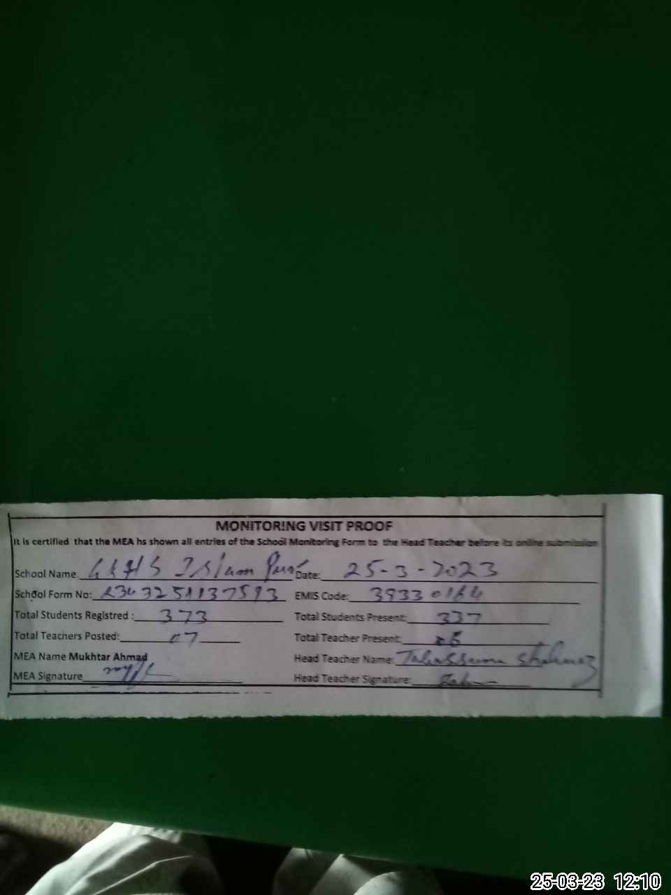 | Attendance Register | Head Teacher | MEA with School | Visit Proof |