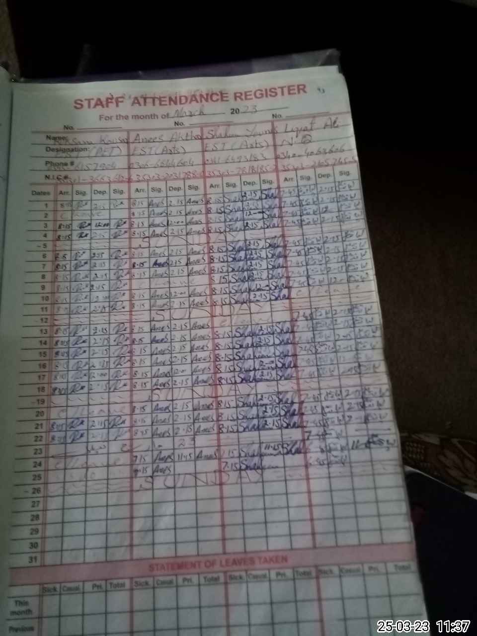 | CNIC | Full Name | Designation | R/C | Absence During Last Calender Month |