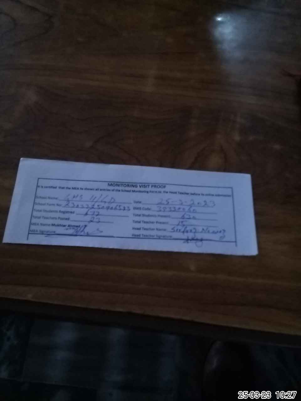 | Attendance Register | Head Teacher | MEA with School | Visit Proof |