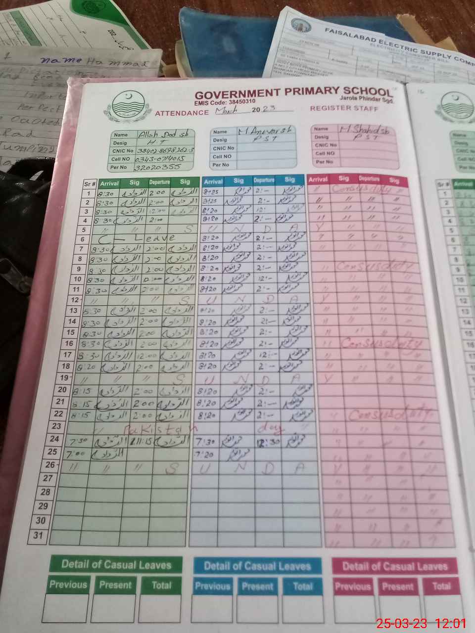 | CNIC | Full Name | Designation | R/C | Absence During Last Calender Month |