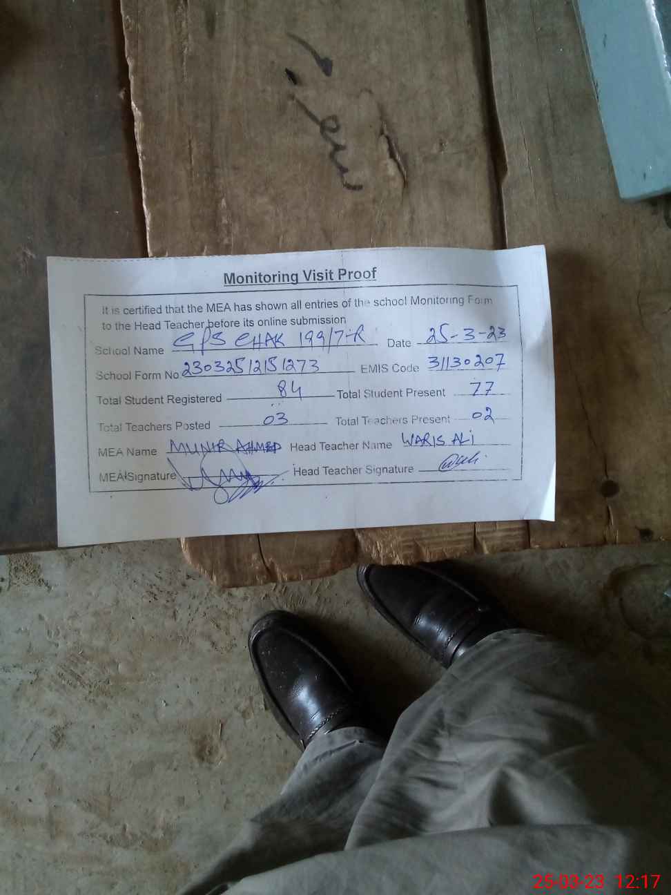 | Attendance Register | Head Teacher | MEA with School | Visit Proof |