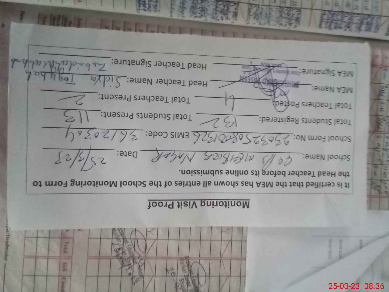 | Attendance Register | Head Teacher | MEA with School | Visit Proof |
