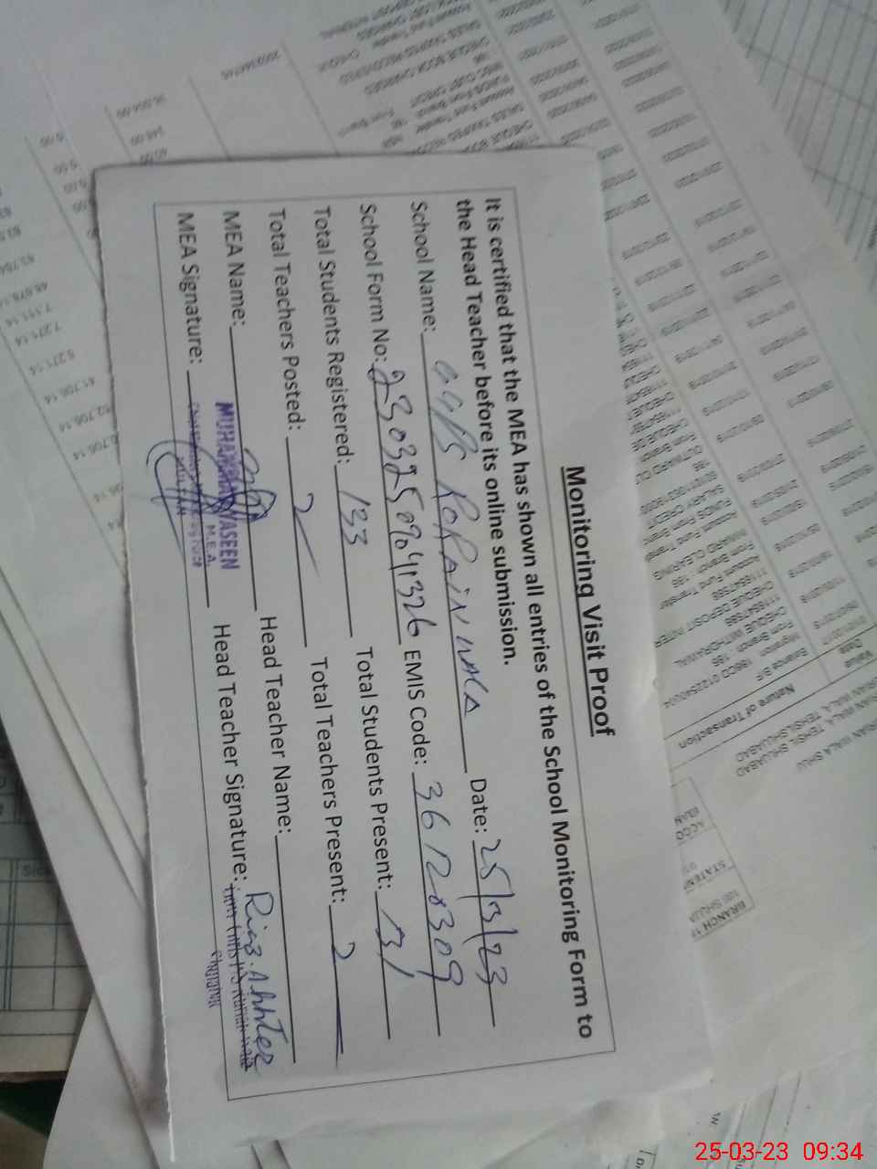 | Attendance Register | Head Teacher | MEA with School | Visit Proof |