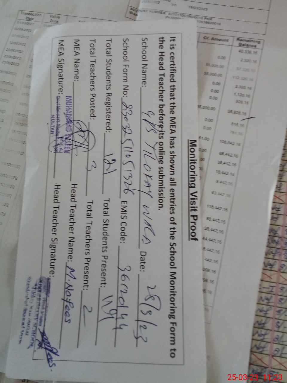 | Attendance Register | Head Teacher | MEA with School | Visit Proof |