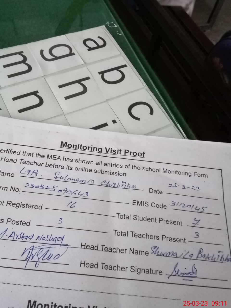 | EMIS Code: 31120145 | Name of School: GPS SULEMANIA CHISHTIAN | |||