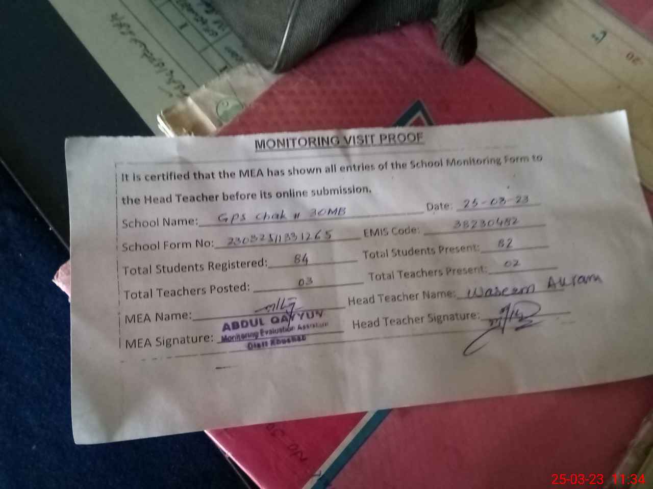 | Attendance Register | Head Teacher | MEA with School | Visit Proof |