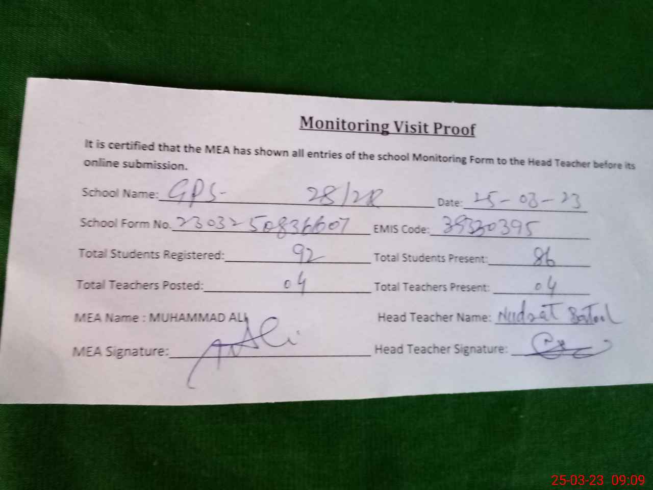 | Attendance Register | Head Teacher | MEA with School | Visit Proof |