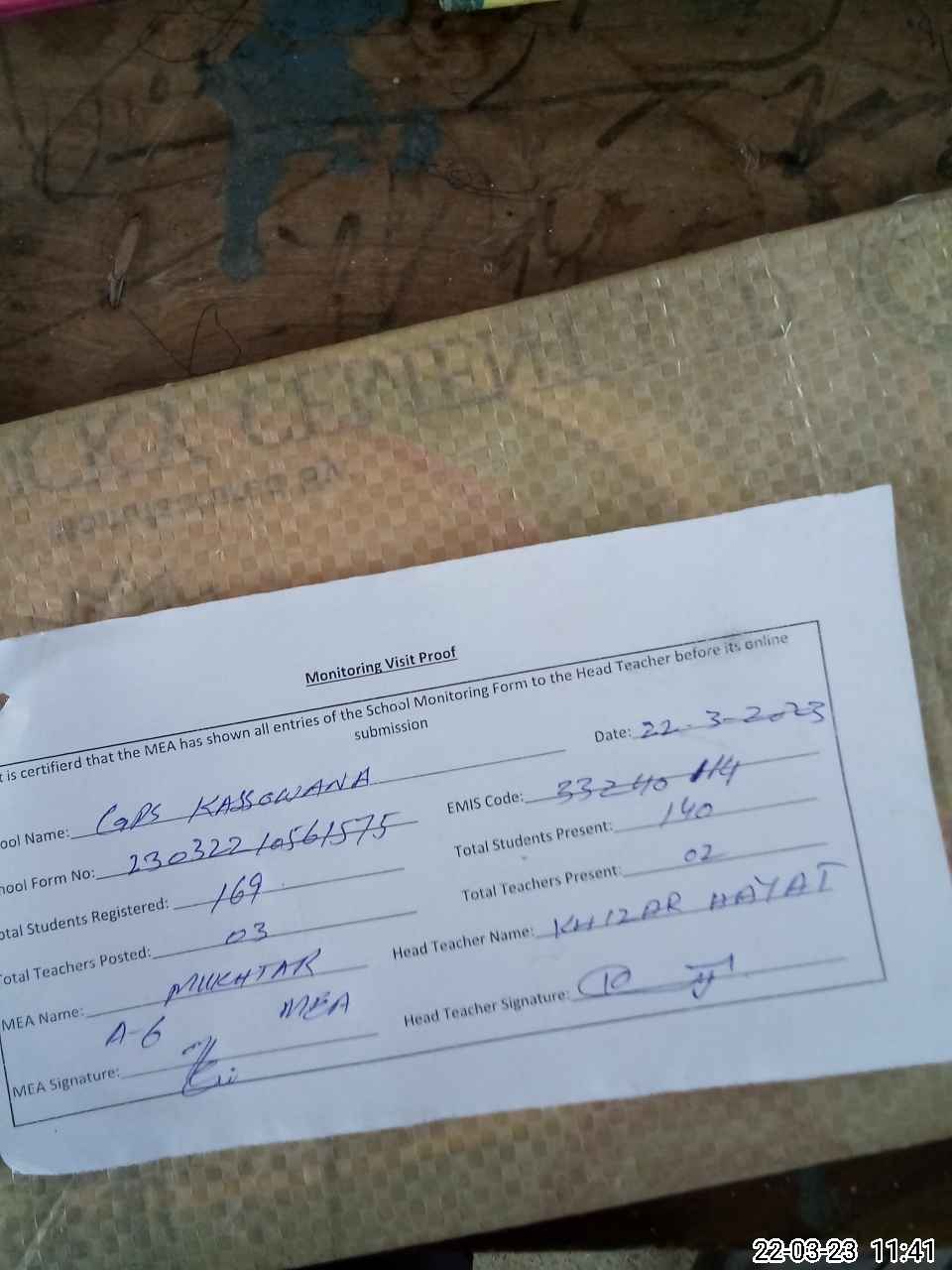 | Attendance Register | Head Teacher | MEA with School | Visit Proof |