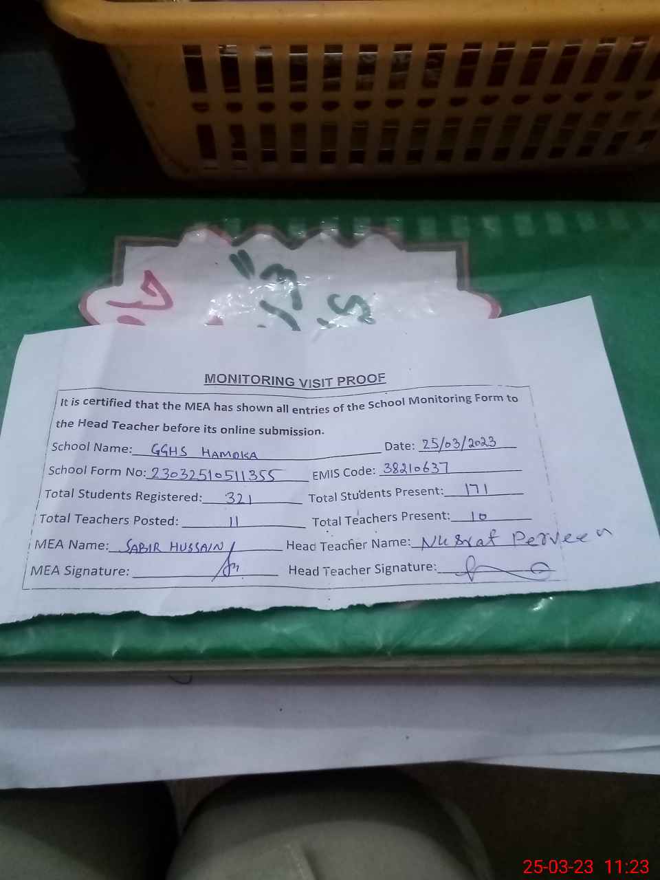 | Certified that this School was Inspected by the Undersigned MEA/DMO Today and the Information Stated Above is as Per Record. | |||||
