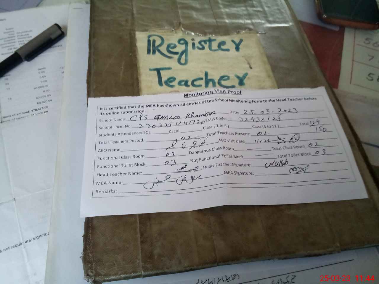 | Attendance Register | Head Teacher | MEA with School | Visit Proof |