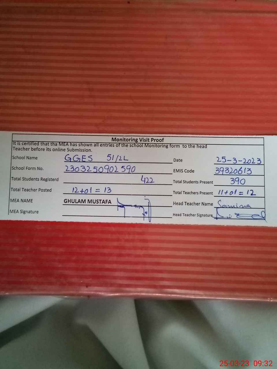 | Attendance Register | Head Teacher | MEA with School | Visit Proof |