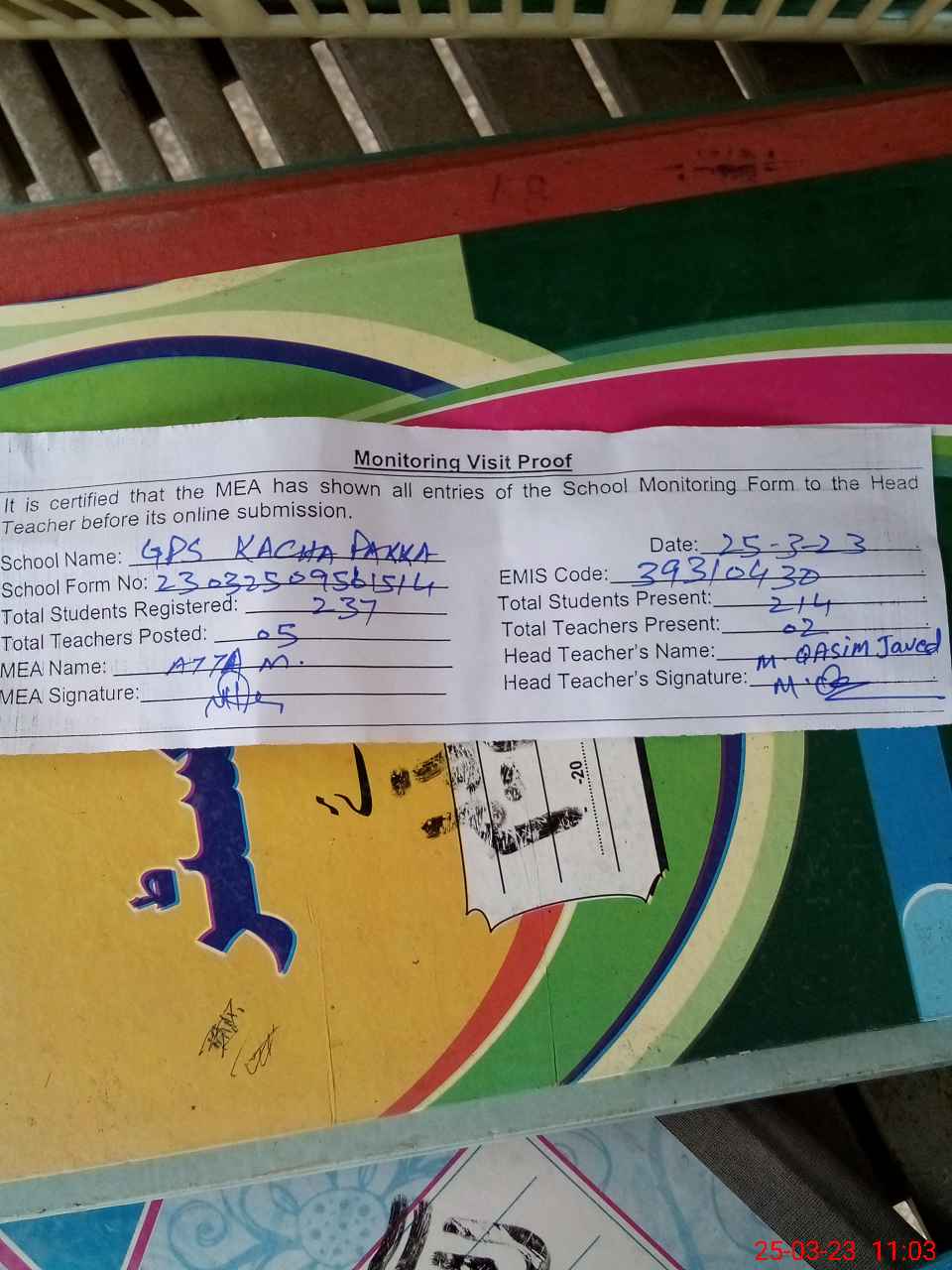 | Attendance Register | Head Teacher | MEA with School | Visit Proof |