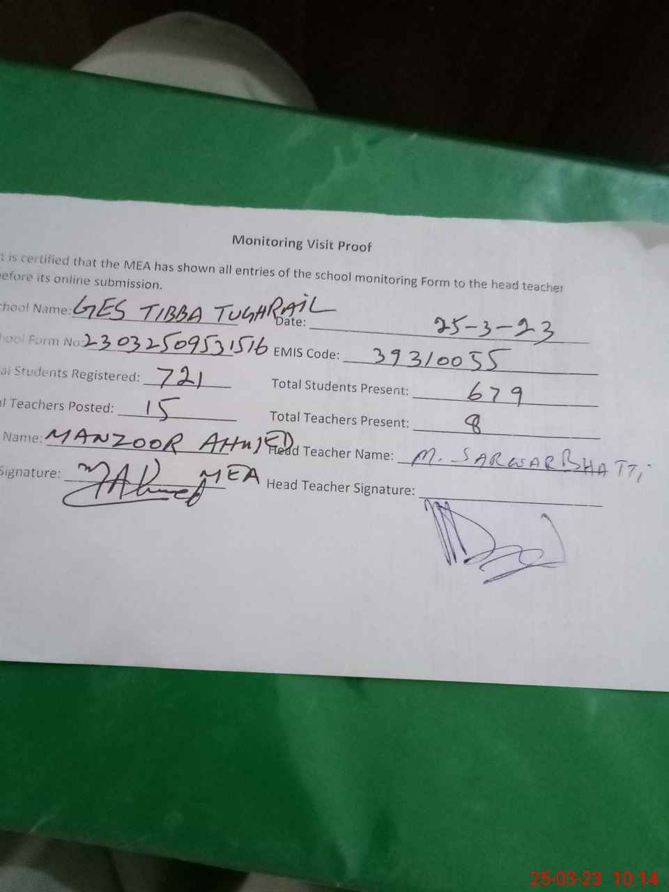 | Attendance Register | Head Teacher | MEA with School | Visit Proof |