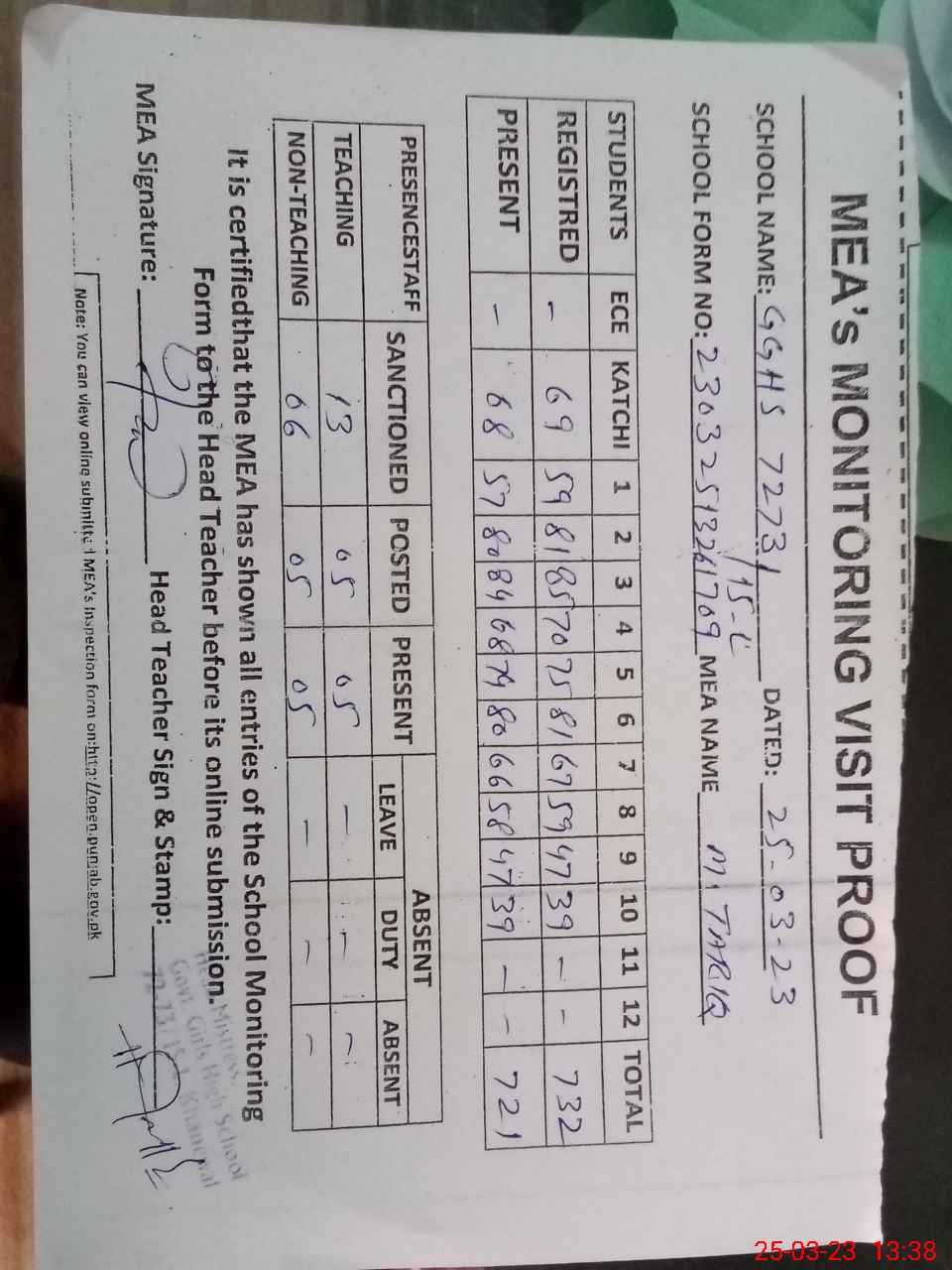 | Attendance Register | Head Teacher | MEA with School | Visit Proof |