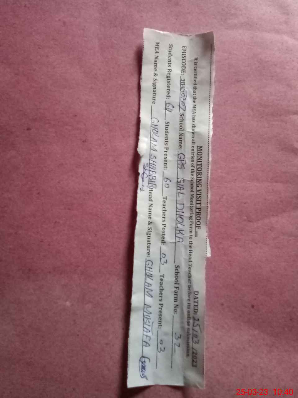 | Attendance Register | Head Teacher | MEA with School | Visit Proof |