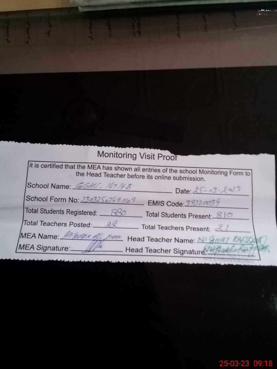 | Attendance Register | Head Teacher | MEA with School | Visit Proof |