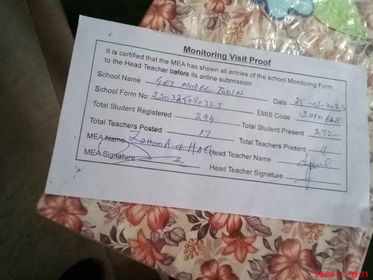 | Attendance Register | Head Teacher | MEA with School | Visit Proof |