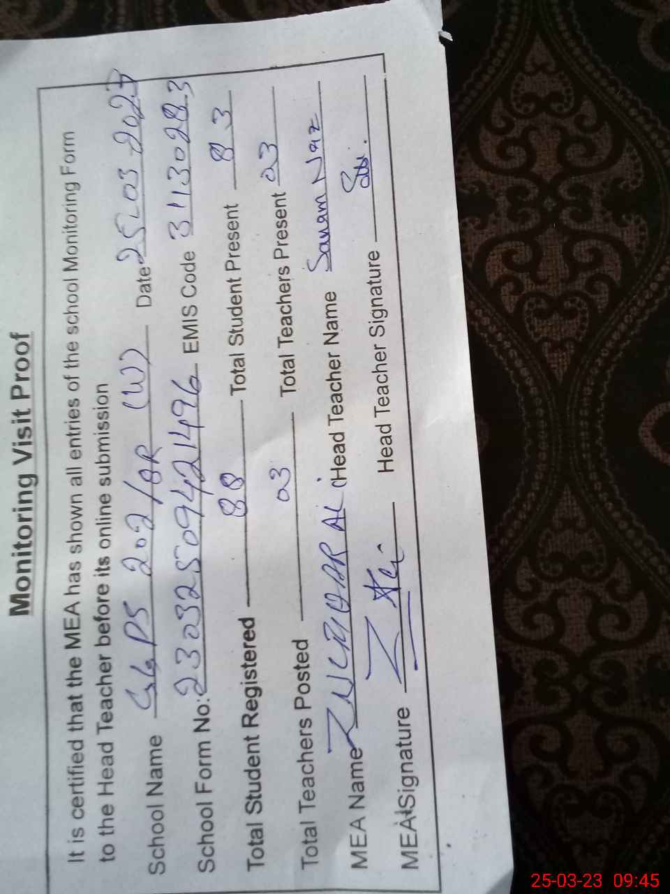 | Attendance Register | Head Teacher | MEA with School | Visit Proof |