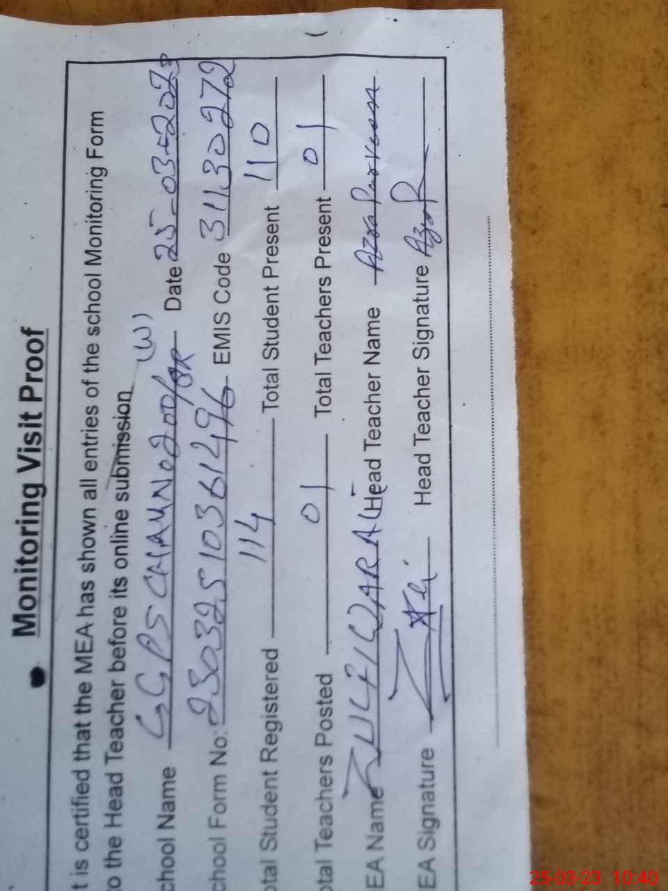 | Name: Az**** Pe**** Designation: (School Headmaster's/Headmistress's) PST Phone/Cell Number: 03**** |