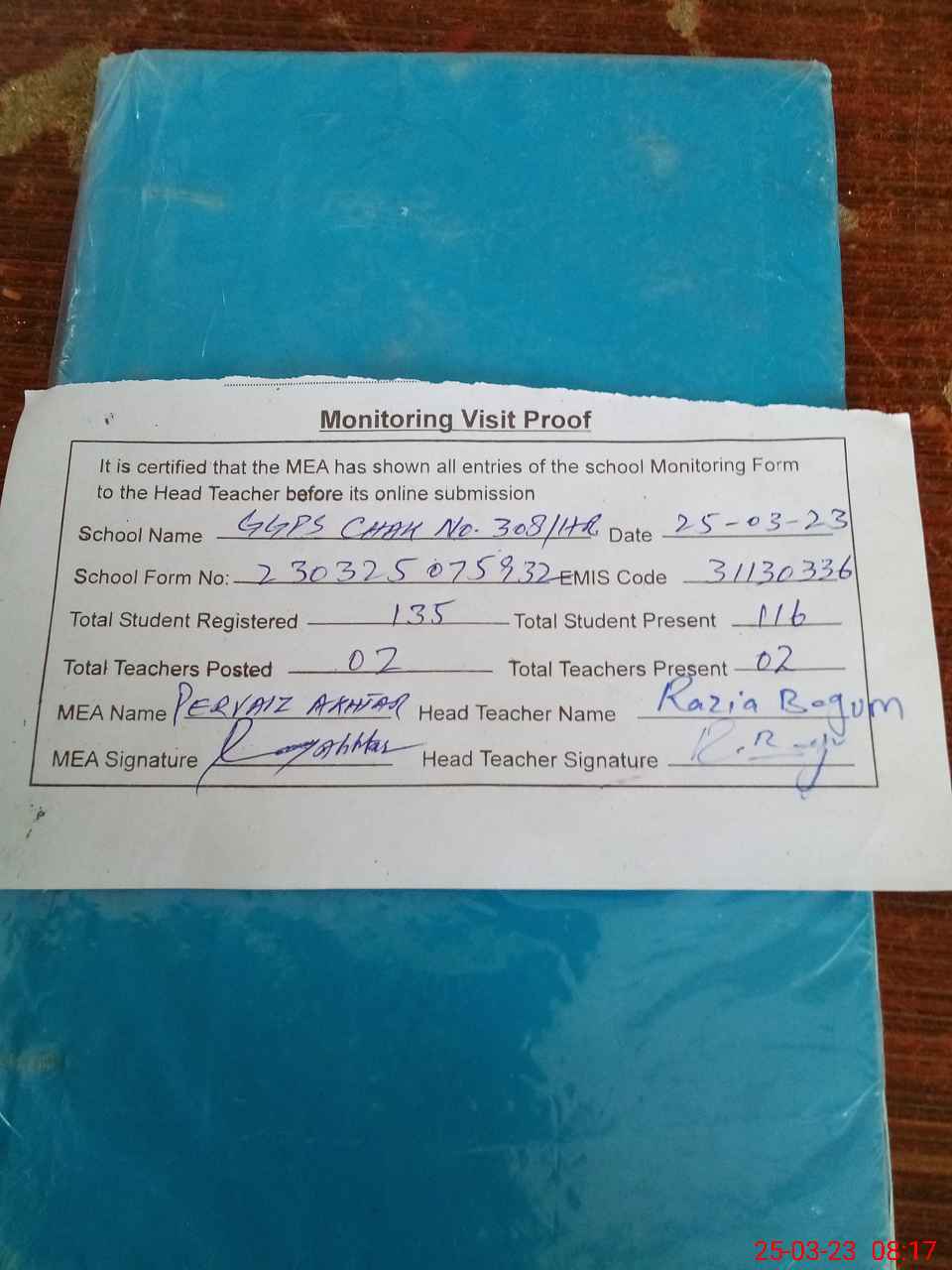 | Attendance Register | Head Teacher | MEA with School | Visit Proof |