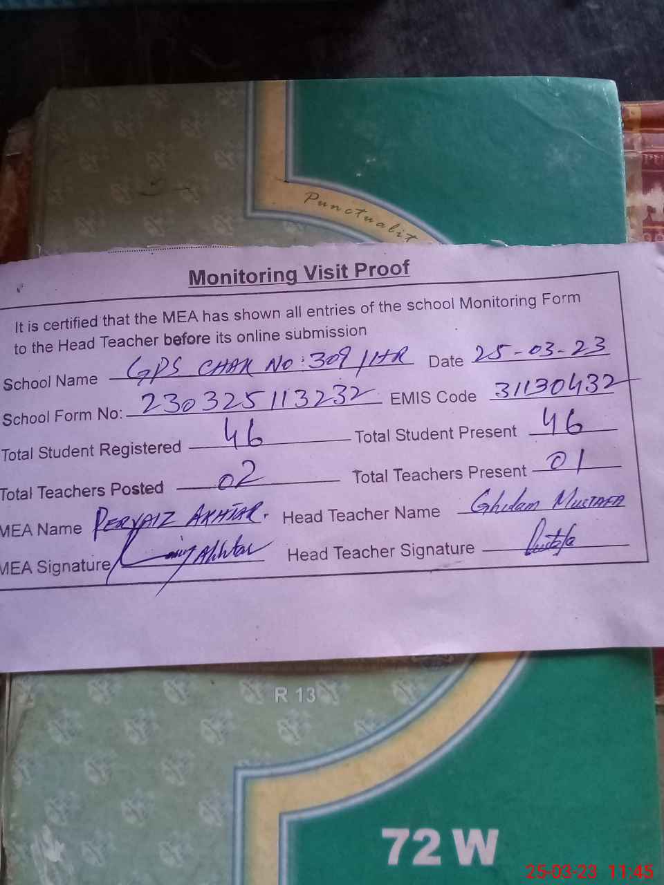 | Attendance Register | Head Teacher | MEA with School | Visit Proof |