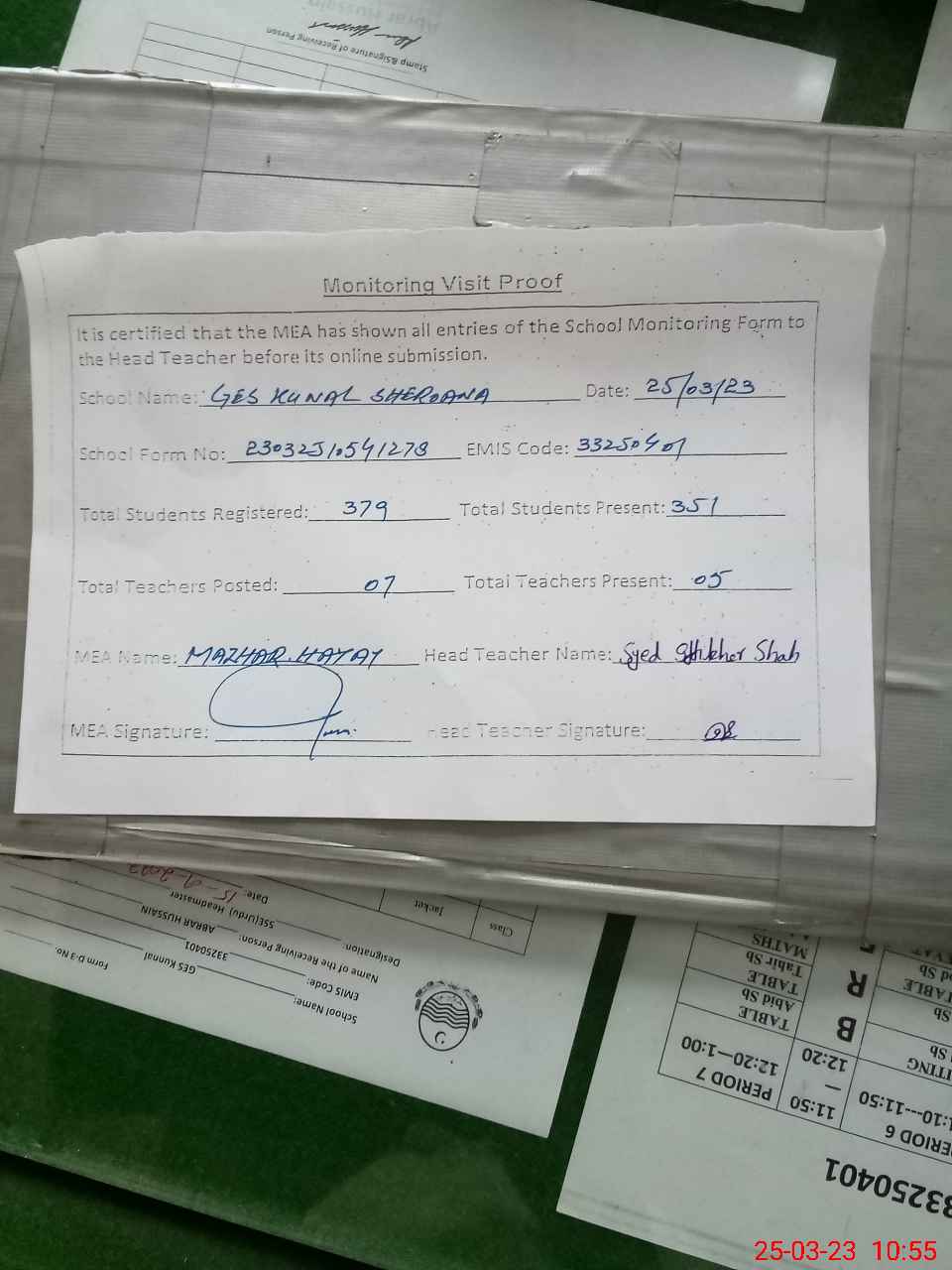 | Certified that this School was Inspected by the Undersigned MEA/DMO Today and the Information Stated Above is as Per Record. | |||||