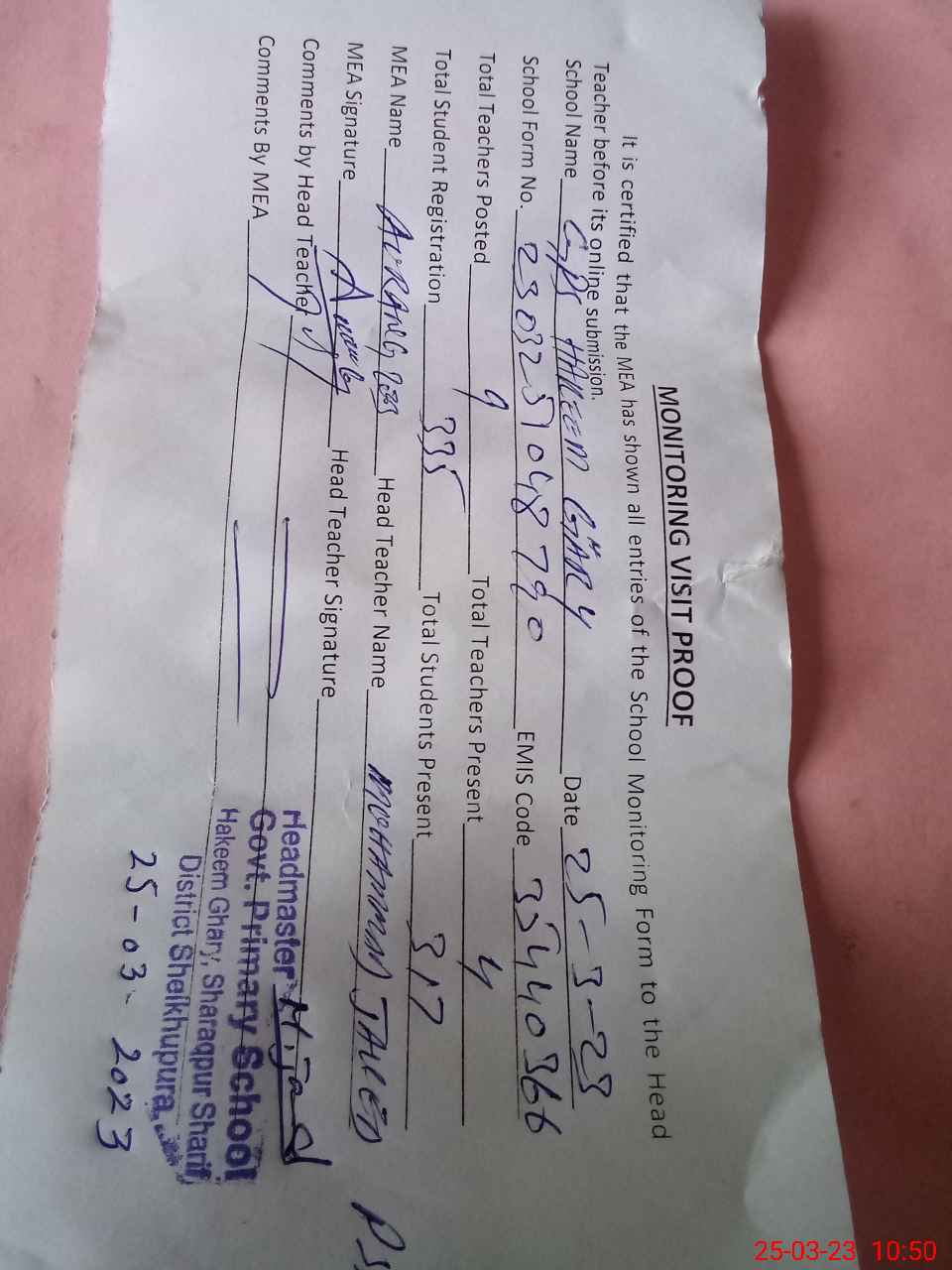 | District: SHEIKHUPURA | Tehsil: SHARAQPUR | Markaz: GHAZI PUR-MALE | Level: Primary | |
