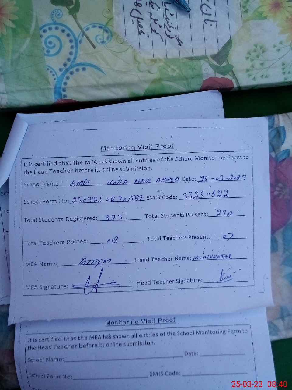 | Name: MU**** MU**** Designation: (School Headmaster's/Headmistress's) PST Phone/Cell Number: 03**** |