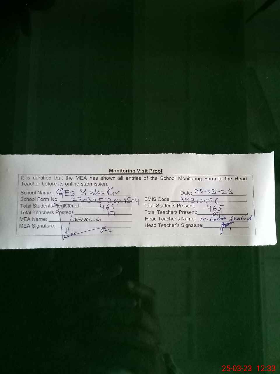 | Attendance Register | Head Teacher | MEA with School | Visit Proof |