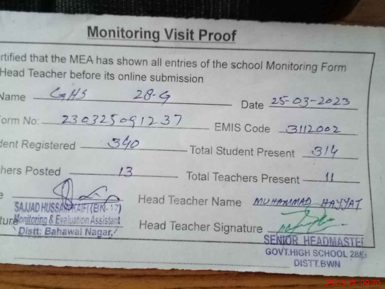 | Attendance Register | Head Teacher | MEA with School | Visit Proof |