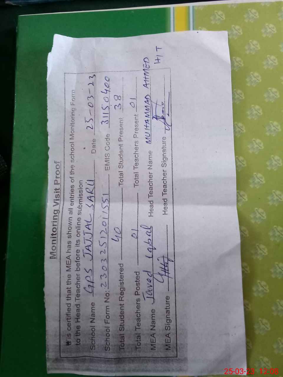 | Attendance Register | Head Teacher | MEA with School | Visit Proof |