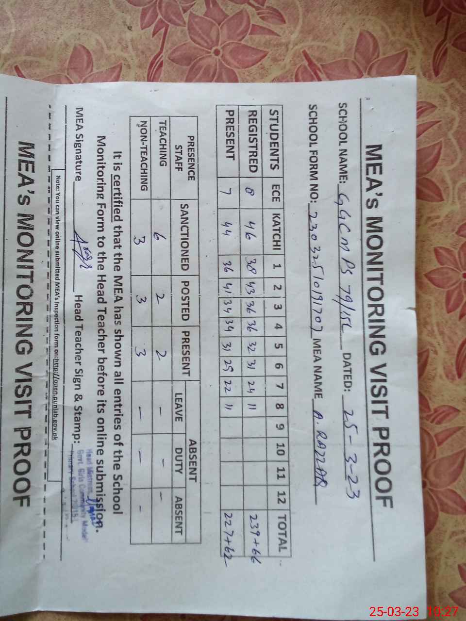 | Attendance Register | Head Teacher | MEA with School | Visit Proof |