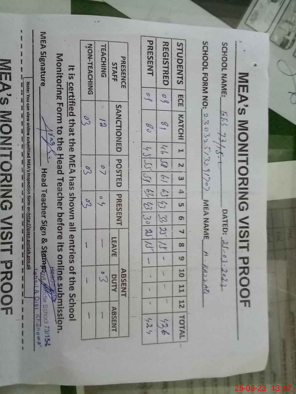 | Certified that this School was Inspected by the Undersigned MEA/DMO Today and the Information Stated Above is as Per Record. | |||||