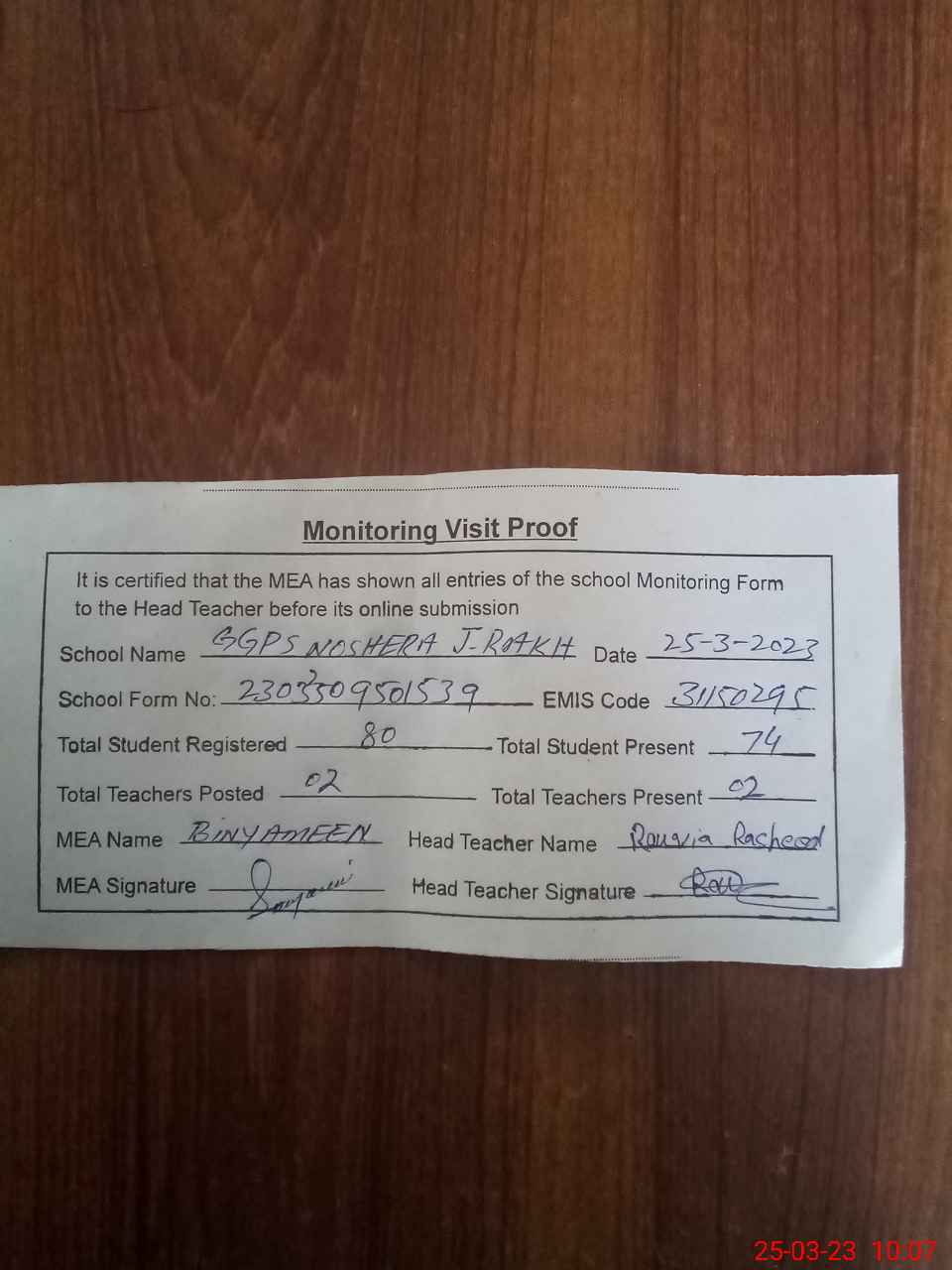 | Attendance Register | Head Teacher | MEA with School | Visit Proof |