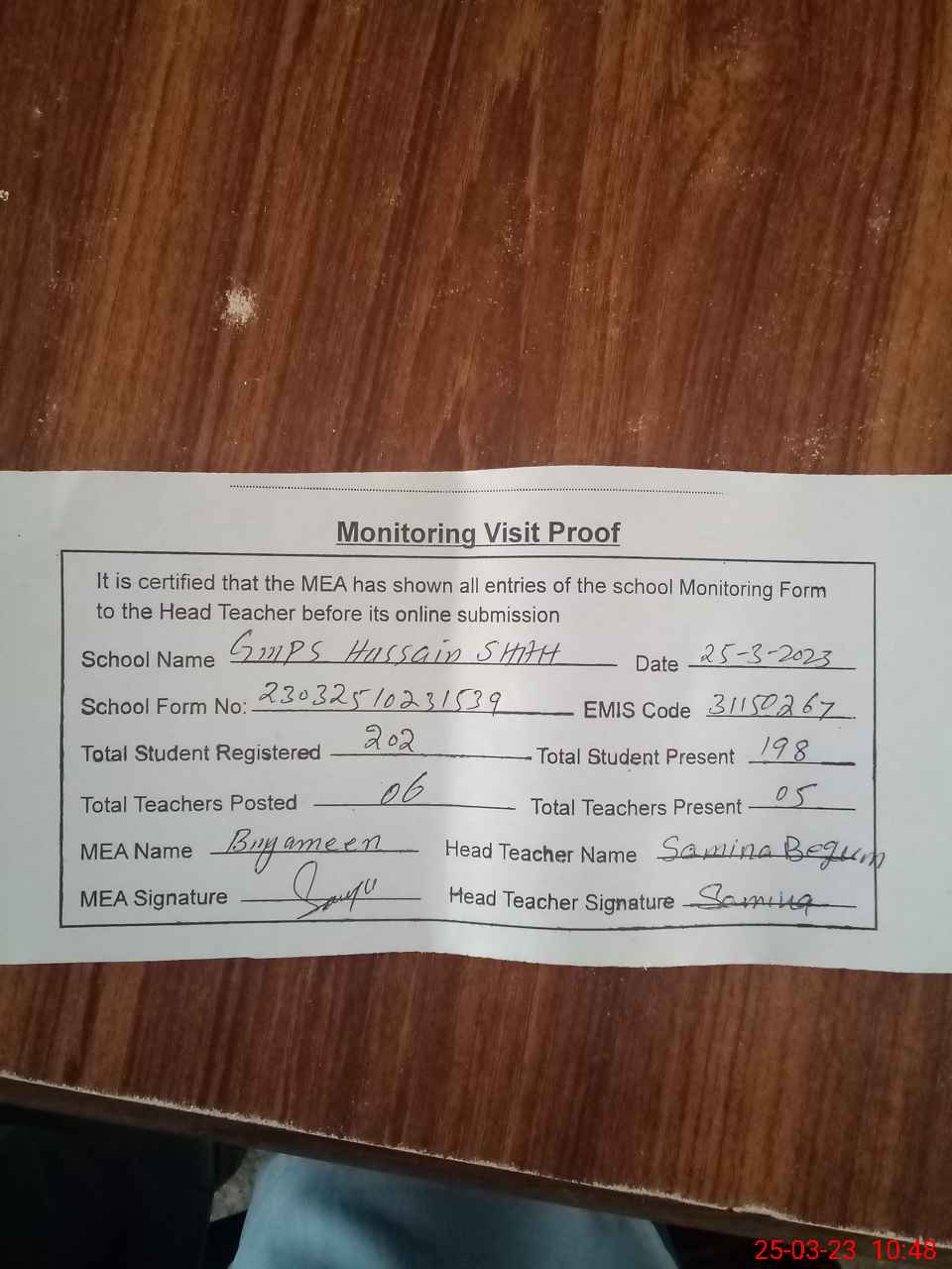 | Attendance Register | Head Teacher | MEA with School | Visit Proof |