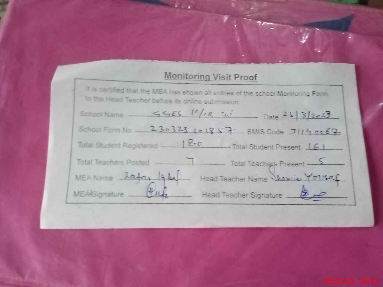 | Attendance Register | Head Teacher | MEA with School | Visit Proof |