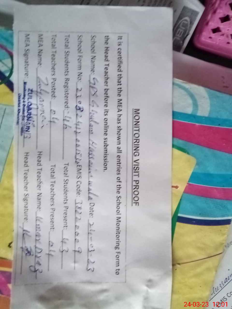 | Attendance Register | Head Teacher | MEA with School | Visit Proof |