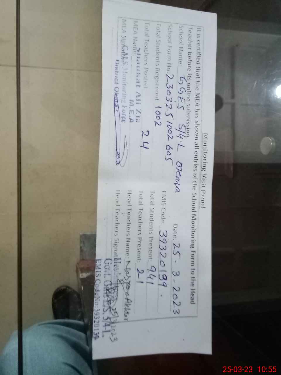 | Monitoring Date: 25-03-2023 | Start Time: 25-03-2023 10:01 AM | End Time: 25-03-2023 10:56 AM | Name of MEA: SH**** AL**** ZI**** (R**** | |