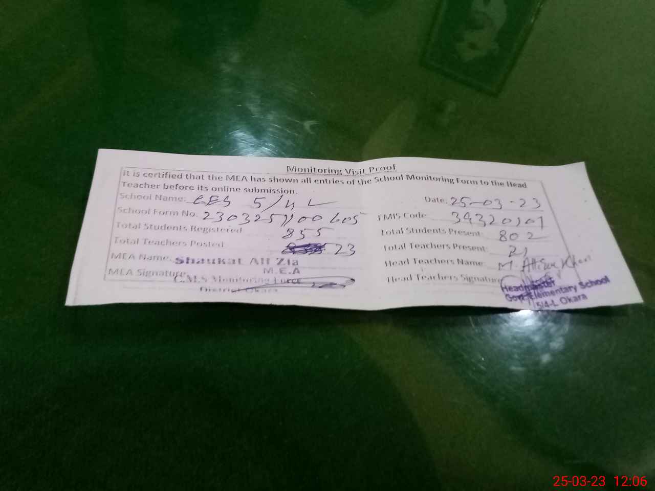 | Attendance Register | Head Teacher | MEA with School | Visit Proof |