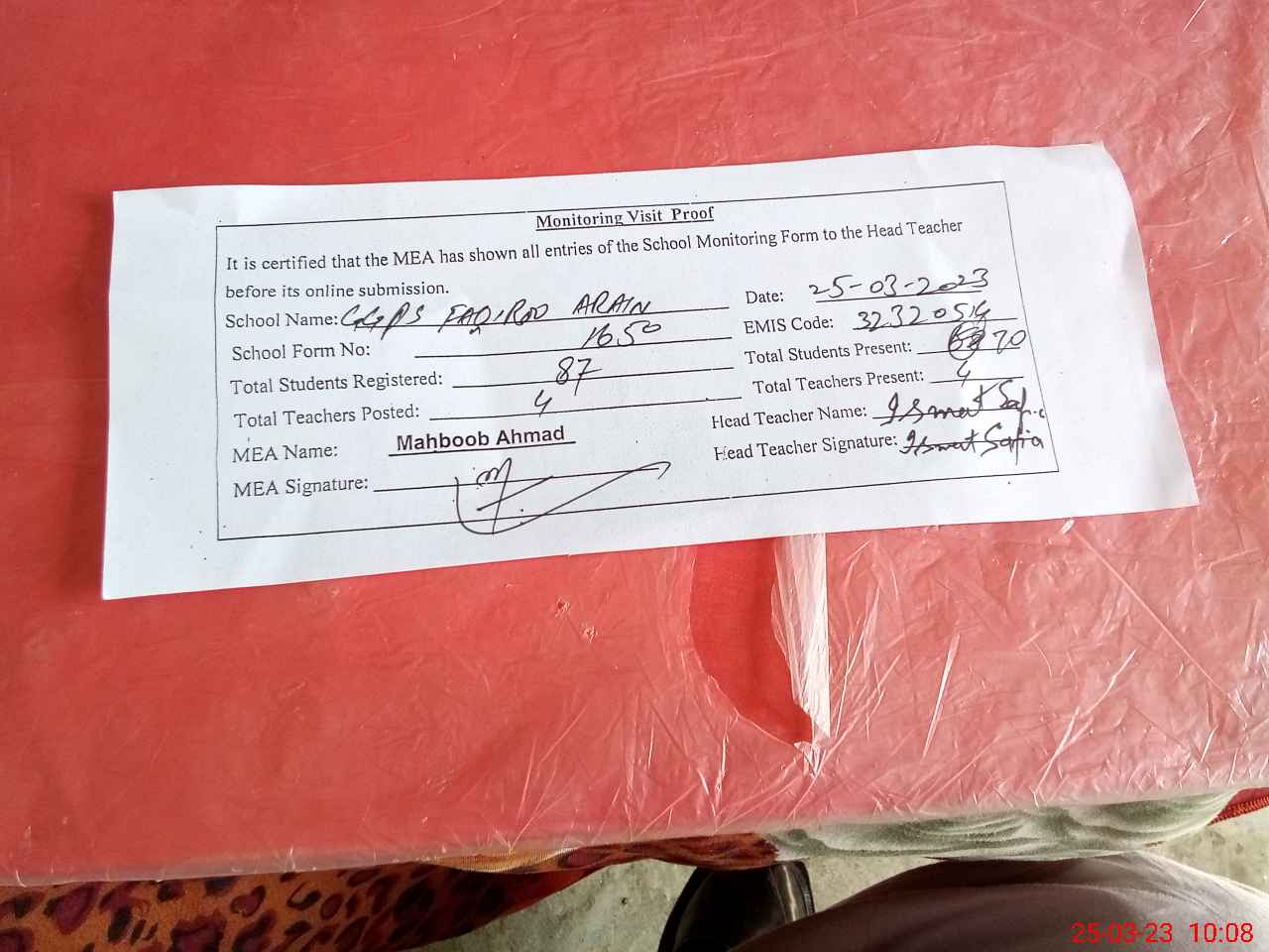 | EMIS Code: 32320514 | Name of School: GGPS FAQIROO ARAIN | |||