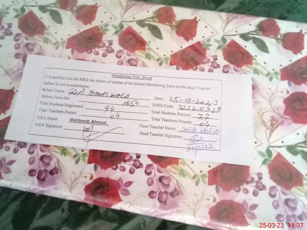 | EMIS Code: 32320529 | Name of School: GGPS YOUNAS WALA | |||