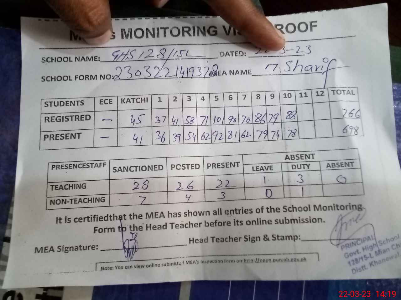 | Attendance Register | Head Teacher | MEA with School | Visit Proof |