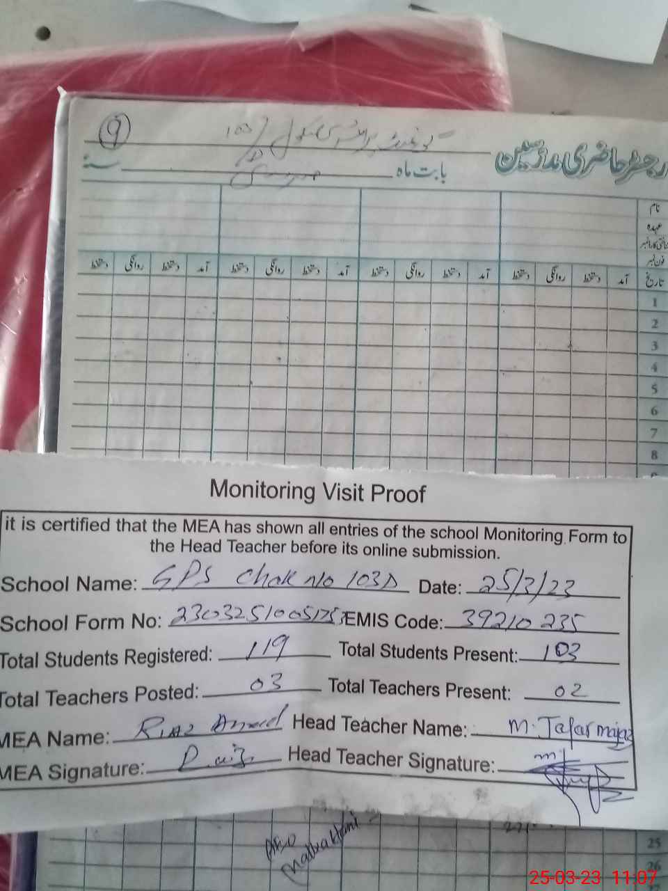 | Attendance Register | Head Teacher | MEA with School | Visit Proof |