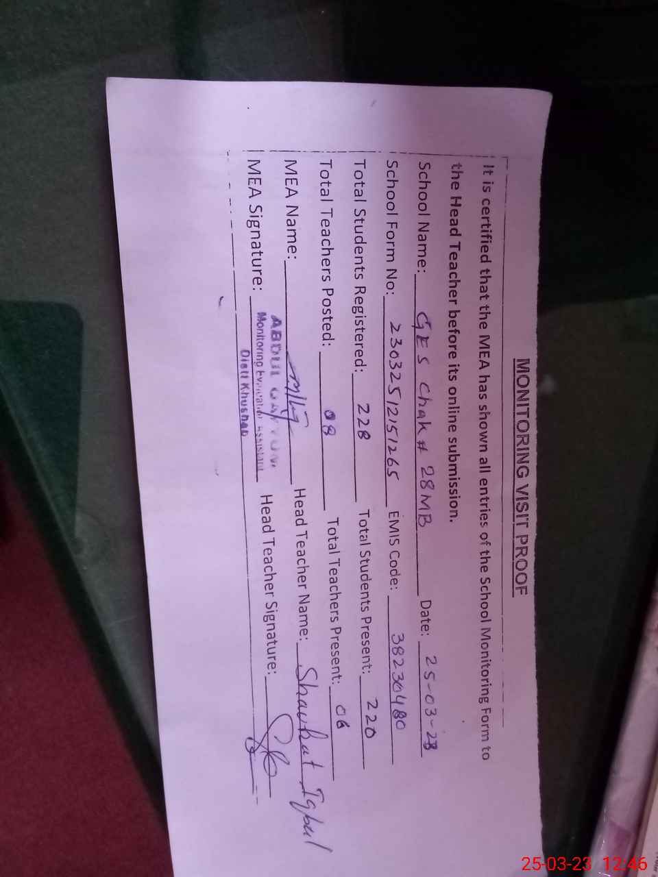 | EMIS Code: 38230480 | Name of School: GES CHAK NO. 28 MB | |||
