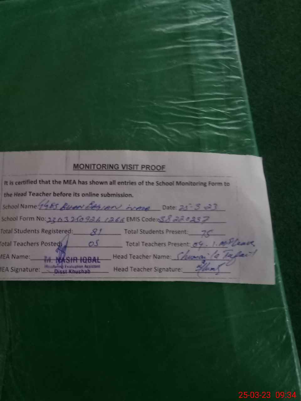 | Attendance Register | Head Teacher | MEA with School | Visit Proof |