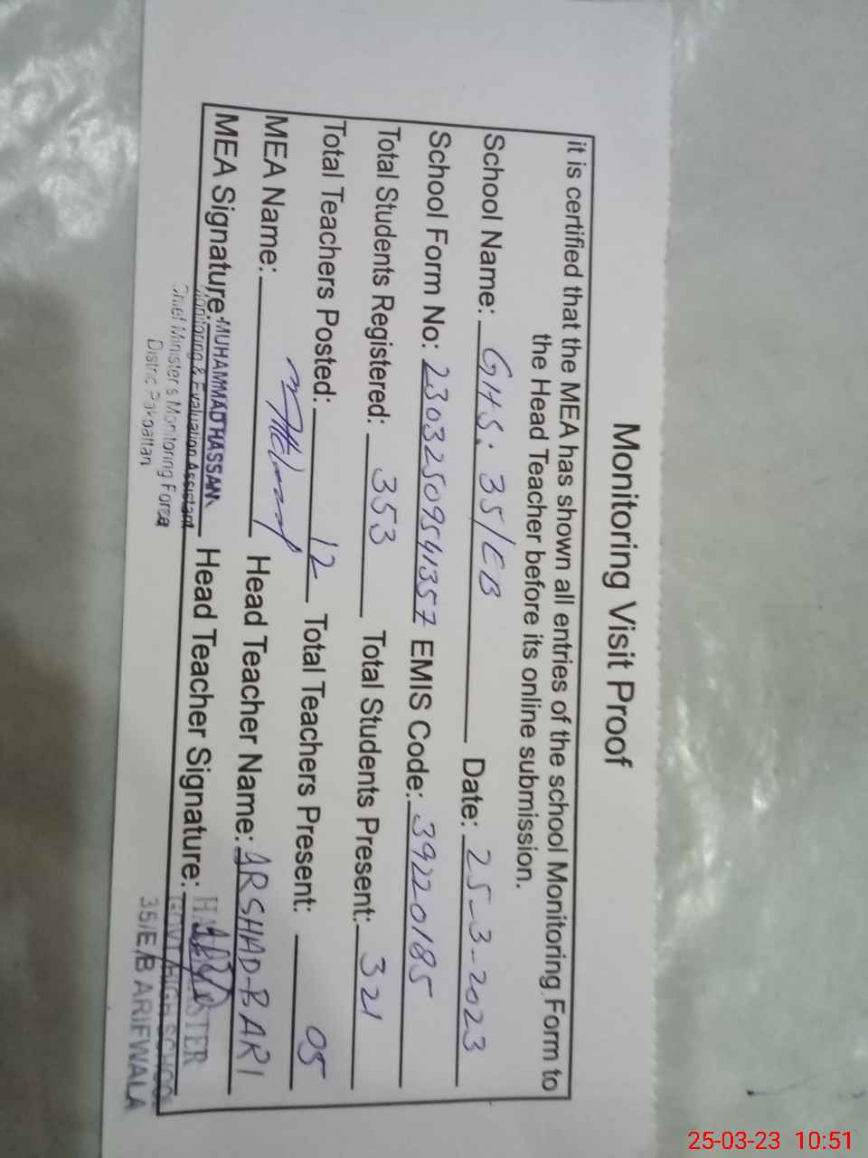 | EMIS Code: 39220185 | Name of School: GHS 35 EB ARIFWALA | |||
