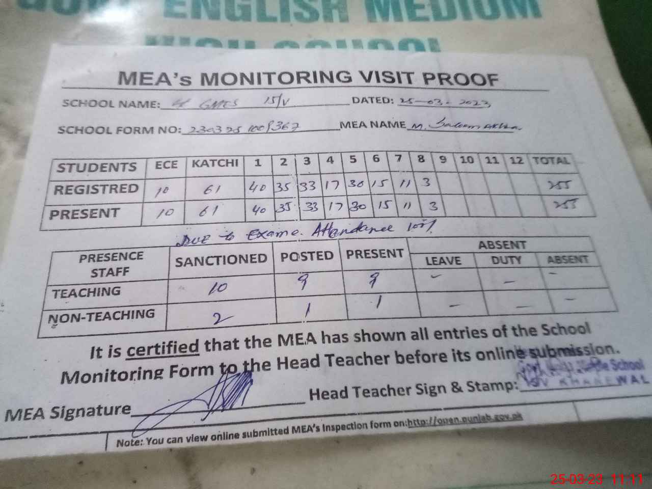 | Attendance Register | Head Teacher | MEA with School | Visit Proof |