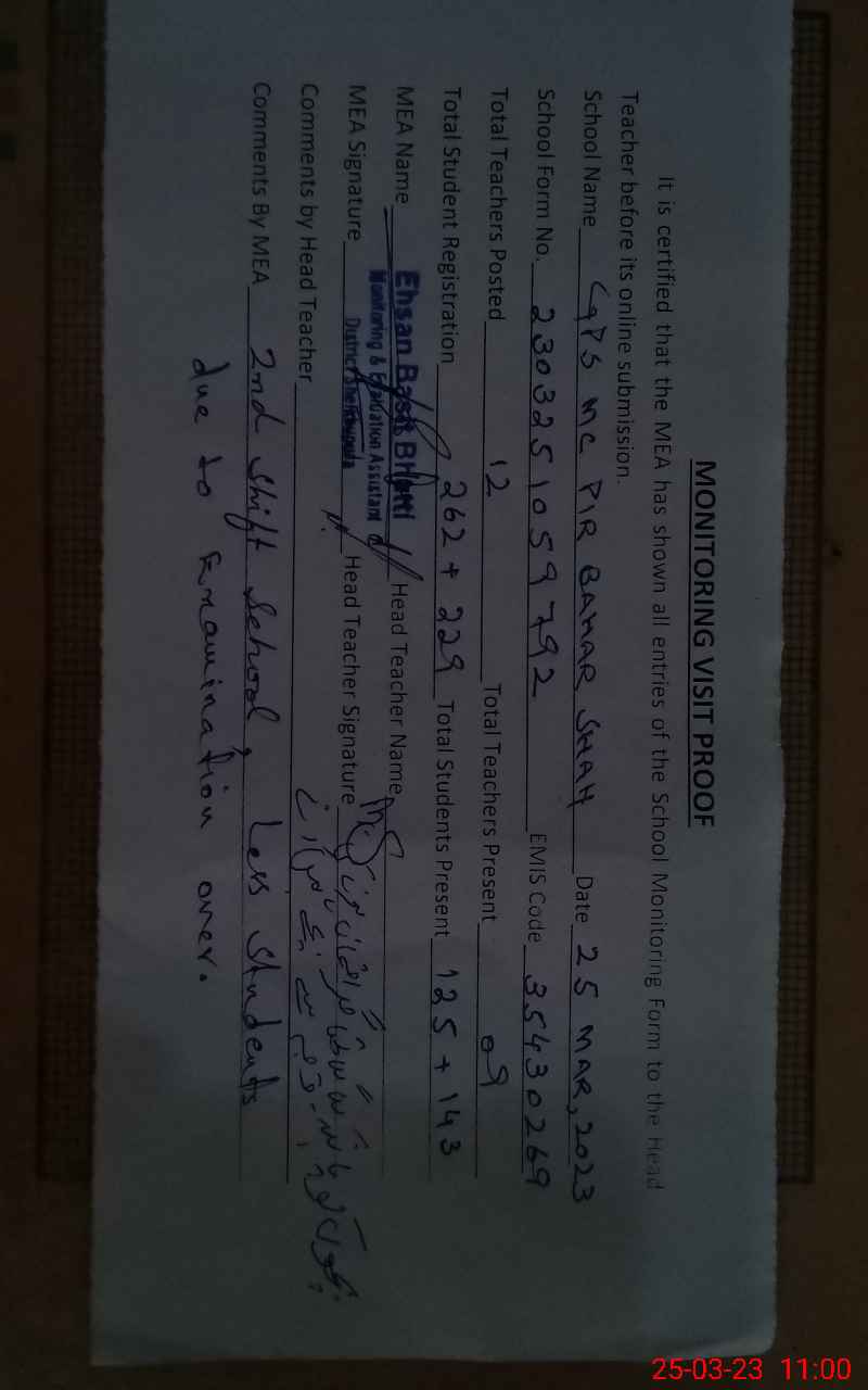 | EMIS Code: 35430269 | Name of School: GPS MC PIR BAHAR SHAH | |||
