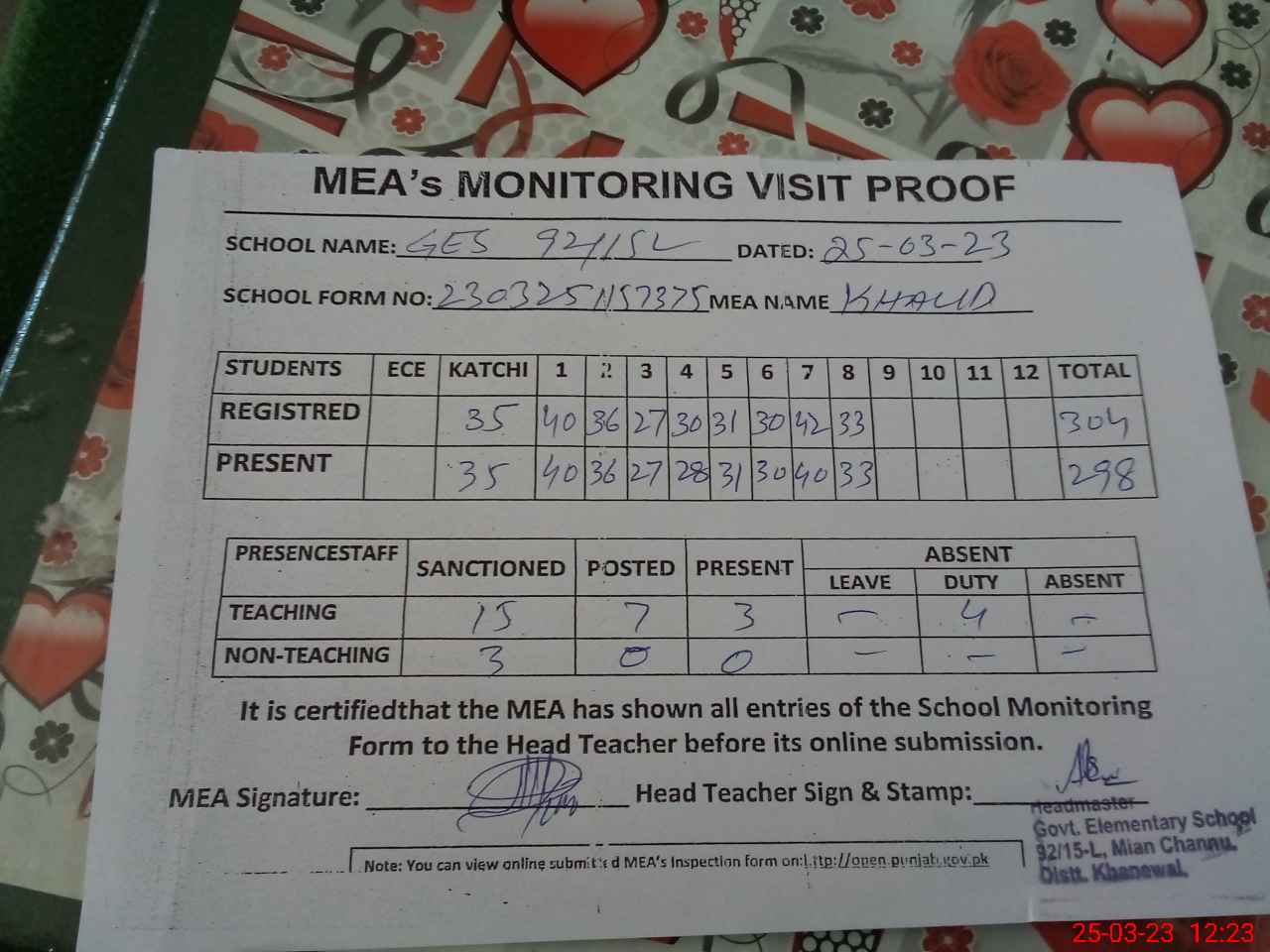| Attendance Register | Head Teacher | MEA with School | Visit Proof |