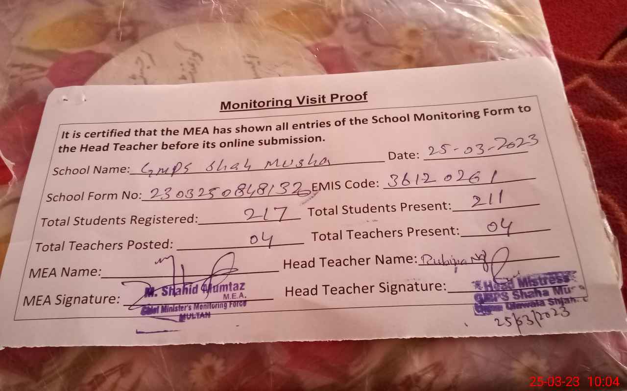 | EMIS Code: 36120261 | Name of School: GMPS SHAH MUSA (IMAM DIN WALA) SHUJABAD | |||